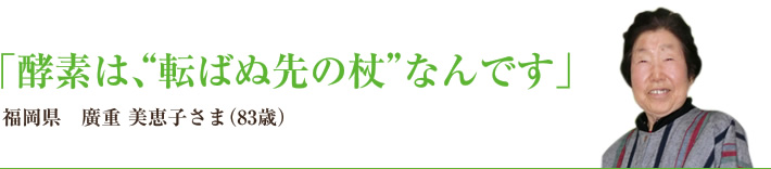 | 体感があるからでしょうね。お薬みたいに、急にここが治ったというのはないですが、飲んでいると調子が良くて、飲まないと何だか調子が出ない。クセがなくておいしいのも、続けられる理由だと思います。 | 普通は1日30mlを、一度に飲んだり小分けにして飲んだりしています。畑仕事で疲れたときは、少し多めに飲みます。牛乳で割って飲むこともありますよ。 | おかげさまで『げんえき酵素』のおかげで病気ひとつしませんので、あちこち旅行に行きたいですね。これがあれば安心なので、温泉旅行も大丈夫かと思います。お友だちと食べ歩きもしたいですね。 | |||||